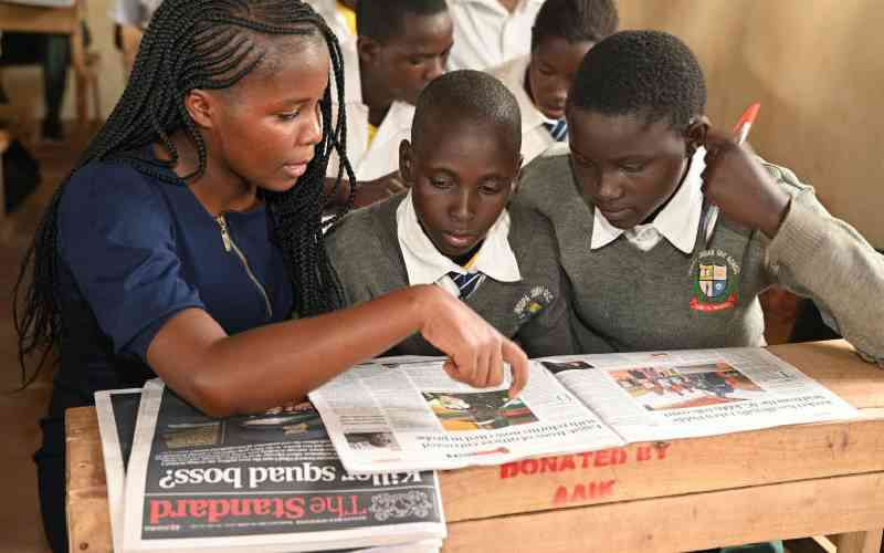 Mercy Muthoni, language teacher at Indupa Comprehensive School reading the newspaper with students during the NIE launch.[Collins Oduor, Standard]