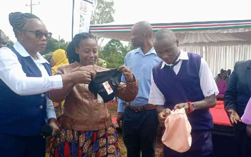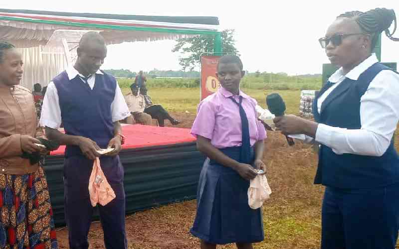 A student demonstrates how sanitary towel is won, during Senator’s Mashinani sensitisation on triple threat- early pregnancies, HIV infections and sexual based violence in Busia County on Oct 6, 2025. [Isaack Mpaka, Standard]