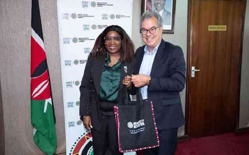 KEPROBA CEO Floice Mukabana and ApexBrasil president Jorge Viana  after they held discussions on priority areas of cooperation between the two export promotion agencies. [Benard Orwongo Standard]