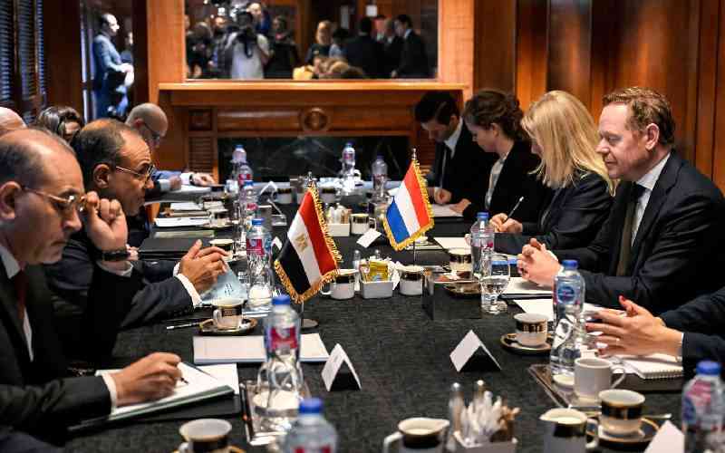 Egypt's Foreign Minister Badr Abdelatty (second left) meets with the Netherlands' Foreign Minister David van Weel (right) at a hotel in Cairo, on October 7, 2025. [AFP]