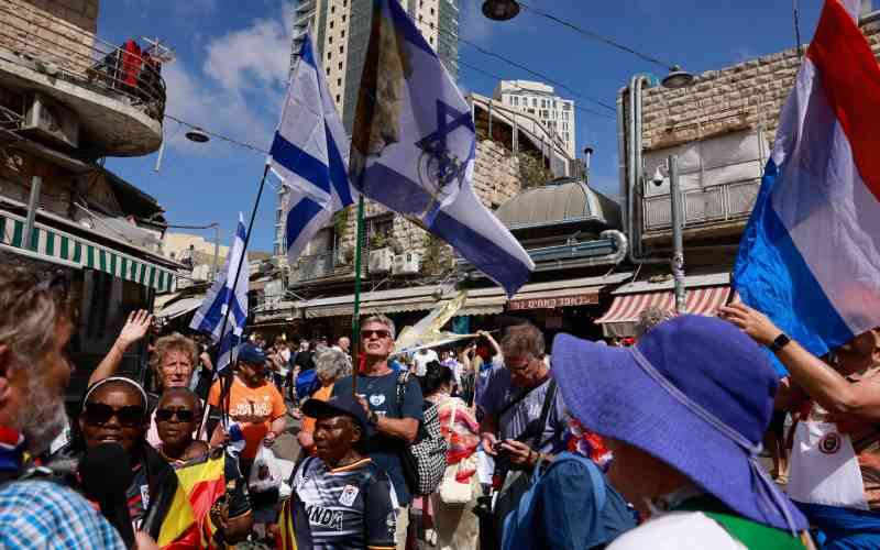 Foreign Christian pilgrims and other supporters of a ceasefire deal march through the Mahane Yehuda market in Jerusalem as they celebrate the Jewish holiday of Sukkot on October 9, 2025.[AFP]
