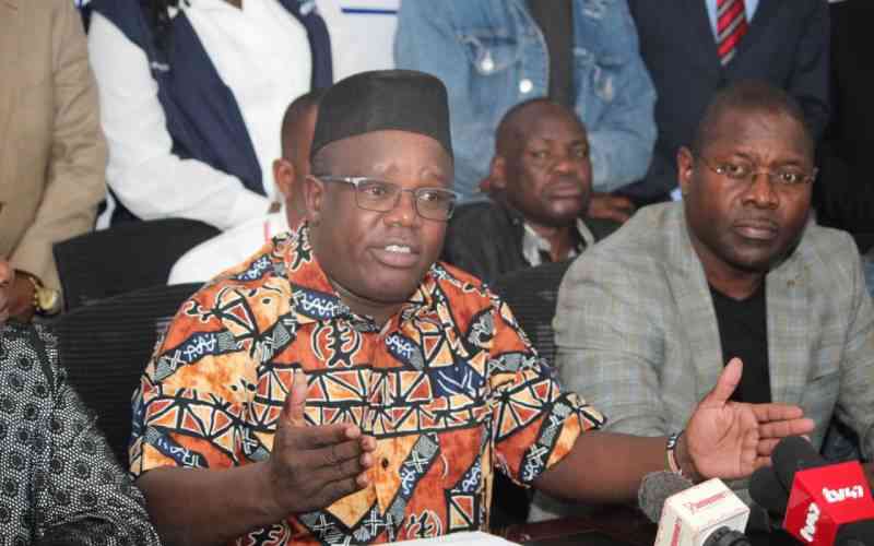 University lecturers unions officials led by UASU Secretary General Dr Constantine Wasonga during a media briefing after National Governing Councils meeting on October 31, 2025. [Benard Orwongo, Standard]