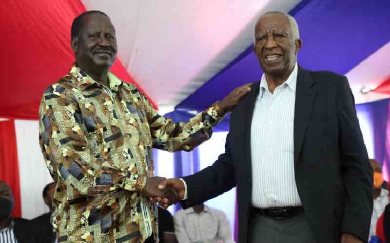 When the late former Prime Minister Raila Odinga was received at Thika Greens Resort in Murang'a County by Equity Bank Chairman Peter Munga. [File, Standard]