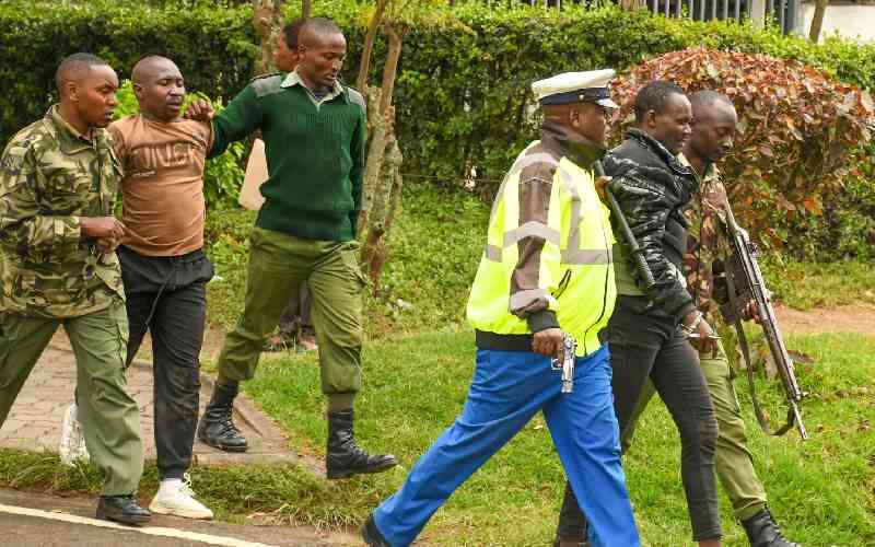 Prison warders escort remandees back to the Nakuru Law Courts after they attempted to escape, on October 23, 2025. [Kipsang Joseph, Standard]
