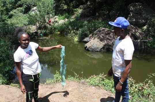 Parents Vivian Agiza and Cosmas Mwanzia of 4-year-old Rachull Anyika point at the spot where the body was found during the interview on November 5, 2025. [ Jenipher Wachie, Standard]