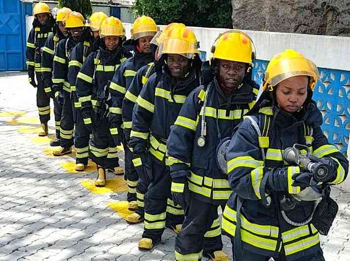 Part of the mandatory Standard of Training, Certification and Watchkeeping (STCW) firefighting drill underway at the Mount Kenya University, Malindi Maritime Academy. [Robert Menza, Standard]